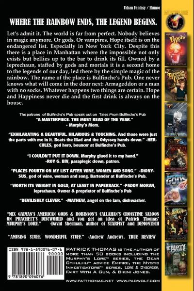 Where the Rainbow Ends, the Legend Begins. Let's admit it. The world is far from perfect. Nobody believes in magic anymore. Or gods. Or vampires. Hope itself is on the endangered list. Especially in New York City. Despite this, there is a place in Manhattan where the impossible not only exists but bellies up to the bar to drink its fill. Owned by a leprechaun, staffed by gods and mortals it is a second home to the legends of our day, led there by the simple magic of the rainbow. The name of the place is Bulfinche's Pub. One never knows what will come in the door next: Armageddon or a man with no socks. Whatever happens, two things are certain. Hope and Happiness never die and the first drink is always on the house. The patrons of Bulfinche's Pub speak out on Tales From Bulfinche's Pub "A MASTERPIECE. THE MUST READ OF THE YEAR." - Murphy's Mom. "EXHILARATING & BEAUTIFUL. HILARIOUS & TOUCHING. And those were just the parts with me in it. Beats the Iliad and the Odyssey hands down." -HERCULES, god hero, bouncer at Bulfinche's Pub. "I COULDN'T PUT IT DOWN. Murphy glued it to my hand." -ROY G. BIV, paraplegic clown, patron. "PLACES FOURTH ON MY LIST AFTER WINE, WOMEN AND SONG." -DIONYSUS, god of wine, woman and song. Bartender at Bulfinche's Pub. "WORTH ITS WEIGHT IN GOLD, AT LEAST IN PAPERBACK." -PADDY MORAN, leprechaun. Owner & proprietor of Bulfinche's Pub "DEVILISHLY CLEVER." -MATHEW, angel on the lam, dishwasher.
