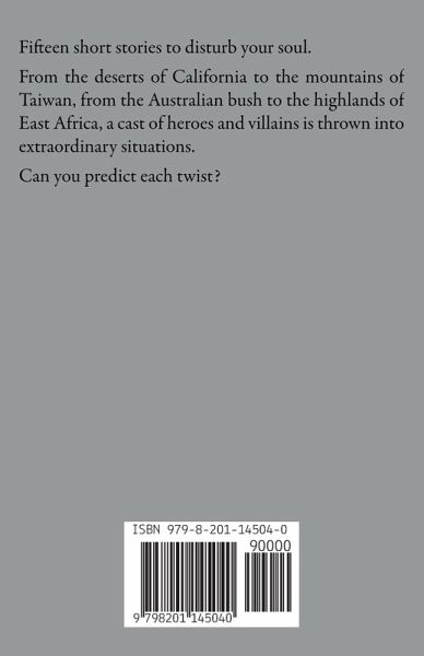 Fifteen short stories to disturb your soul. From the deserts of California to the mountains of Taiwan, from the Australian bush to the highlands of East Africa, a cast of heroes and villains is thrown into extraordinary situations. Can you predict each twist?