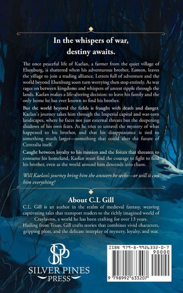 In the whispers of war, destiny awaits. The once peaceful life of Kaelan, a farmer from the quiet village of Elsenburg, is shattered when his adventurous brother, Eamon, leaves the village to join a trading alliance. Letters full of adventure and the world beyond Elsenburg soon turn worrying then stop entirely. As war rages on between kingdoms and whispers of unrest ripple through the lands, Kaelan makes a life-altering decision: to leave his family and the only home he has ever known to find his brother. But the world beyond the fields is fraught with death and danger. Kaelan's journey takes him through the Imperial capital and war-torn landscapes, where he faces not just external threats but the deepening shadows of his own fears. As he tries to unravel the mystery of what happened to his brother, and that his disappearance is tied to something much larger-something that could alter the future of Centralia itself. Caught between loyalty to his mission and the forces that threaten to consume his homeland, Kaelan must find the courage to fight to find his brother, even as the world around him descends into chaos. Will Kaelan's journey bring him the answers he seeks-or will it cost him everything? About C.L Gill C.L. Gill is an author in the realm of medieval fantasy, weaving captivating tales that transport readers to the richly imagined world of Craylavros, a world he has been crafting for over 13 years. Hailing from Texas, Gill crafts stories that combines vivid characters, gripping plots, and the delicate intertwining of mystery, loyalty, and war.