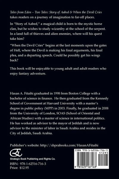 Tales from Eden - Two Tales: Story of Aabed & When the Devil Cries takes readers on a journey of imagination to far-off places. In "Story of Aabed," a magical child is born to the mystic horse clan, but he wishes to study wizardry at the school of the serpent. In a land full of thieves and alien enemies, where will his quest take him? "When the Devil Cries" begins at the last moments upon the gates of Hell, where the Devil is making his final arguments, his final plea, and a departing speech. Could he possibly get his wings back? This book will be enjoyable to young adult and adult readers who enjoy fantasy adventure. Hasan A. Fitaihi graduated in 1998 from Boston College with a bachelor of science in finance. He then graduated from the Kennedy School of Government at Harvard University with a master's degree in public policy (MPP) in 2003. Finally, he graduated in 2008 from the University of London, SOAS (School of Oriental and African Studies) with a master of science in international politics. He has worked as advisor to the mayor of Jeddah and is now advisor to the minister of labor in Saudi Arabia and resides in the City of Jeddah, Saudi Arabia. Publisher's website: http://sbprabooks.com/HasanAFitaihi