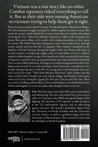 Behind the scenes of America's first TV war. "With the proliferation of televisions, news networks strived to have the most exciting, dramatic, and attractive stories. They competed for the finest reporters, highest-rated equipment, and largest number of viewers. ... For the first time in American history, the news from the front lines was brought straight into the living room." - Jessie Kratz, Historian of the National Archives As American families sat down for dinner in front of their TV sets 50 years ago, horrific stories from Vietnam flashed across the screen. It was one of the country's bloodiest conflicts and we had a front-row seat 10,000 miles away Vietnam has been the subject of hundreds of books, movies and commentaries for decades. But we know little about how these stories were gathered and told, nor about the men and women who risked everything to tell them. Our gaze back then was on the fighting at a time when the war everyone hated and feared reached a climax. "Tales from Monkey Mountain: Stories of the Vietnam War" is a different account of Vietnam. It is a war seen through the eyes of a young Navy press escort officer stationed in DaNang, not far from the Demilitarized Zone separating the Vietnamese north and south. Mike Hoyt became immersed in almost every aspect of the war and in the telling of its stories. A trained journalist, Hoyt takes us into the heart of the conflict for a rare look behind the scenes at how the news media went about covering the fighting. "Tales from Monkey Mountain" takes us on a journey through the strange, uncharted waters of news gathering in combat. We follow Hoyt down dangerous rivers, into smoky bars, through enemy attacks, onto the flight decks of aircraft carriers, on Swift Boats and river patrols, lumbering Navy supply boats dodging mines and into furious Naval gunfire support missions on the South China Sea. We glimpse the inner world of Vietnam and its remote, ancient villages and hamlets w