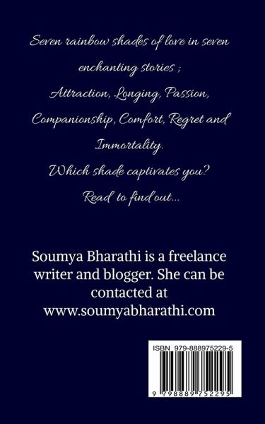 Love. How does one describe this shape-shifter? How do mere words suffice to define an emotion that feels as light as a feather and yet there are times when it weighs you down like a rock in the heart? It casts a spell, and just when one is busy getting starry eyed at the magical pixie dust, it vanishes in thin air; but don't you call it ephemeral because it is like a string of jasmine, whose fragrance lingers long after it's gone… The only way to understand love is to feel it. Deep in your heart. There are so many shades of this emotion. Each of these different shades of love deserve a story of their own. The aim of this short story collection is to capture on the canvas, every shade of love in all its glory, through each of these 7 stories, so that in the end, the reader can experience one, two, many or all shades of love. Attraction, longing, passion, companionship, comfort, regret and immortality... 7 rainbow shades of love captured in seven different stories; Are you ready to be enchanted by these myriad shades of love?