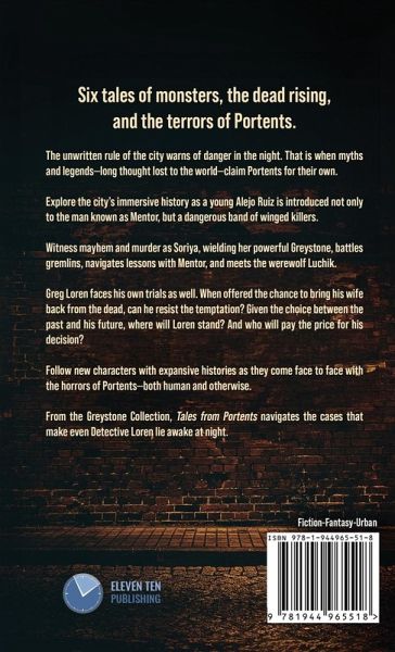 Six tales of monsters, the dead rising, and the terrors of Portents. The unwritten rule of the city warns of danger in the night. That is when myths and legends-long thought lost to the world-claim Portents for their own. Explore the city's immersive history as a young Alejo Ruiz is introduced not only to the man known as Mentor, but a dangerous band of winged killers. Witness mayhem and murder as Soriya, wielding her powerful Greystone, battles gremlins, navigates lessons with Mentor, and meets the werewolf Luchik. Greg Loren faces his own trials as well. When offered the chance to bring his wife back from the dead, can he resist the temptation? Given the choice between the past and his future, where will Loren stand? And who will pay the price for his decision? Follow new characters with expansive histories as they come face to face with the horrors of Portents-both human and otherwise. From the Greystone Collection, Tales from Portents navigates the cases that make even Detective Loren lie awake at night.