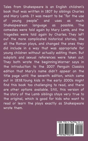 Tales from Shakespeare is an English children's book that was written in 1807 by siblings Charles and Mary Lamb. It was meant to be "for the use of young people" and uses as much Shakespearean language as possible. The comedies were told again by Mary Lamb, and the tragedies were told again by Charles. They left out the more complicated historical stories, like all the Roman plays, and changed the ones they did include in a way that was appropriate for young children without actually editing them. But subplots and sexual references were taken out. They both wrote the beginning. Warner says in the introduction to the 2007 Penguin Classics edition that Mary's name didn't appear on the title page until the seventh edition, which came out in 1838. Young kids in the early 2000s might find this book too challenging to read, and there are other options available. Still, this version of the story of the Lamb siblings stays very true to the original, which is good for kids who want to read or learn the plays exactly as Shakespeare wrote them.