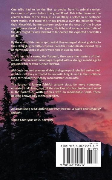 One tribe had to be the first to awake from its primal slumber thousands of years before the great flood. This tribe becomes the central feature of the tales, it is essentially a selection of pertinent short stories that trace this tribes progress over the millennia from their Mesolithic hunter-gatherer society to the onset of the bronze age. Forever ahead of the game, this tribe and some peculiar traits of the day forged its way forward to far exceed the expected necessities of life. By the end of this overly epic period they emerged almost god-like to their struggling neolithic cousins. Even their subordinate servant class of many thousands of years were held in awe by some. This tribe had a name, the Tospeari, they were the masters of their world, an advanced technology coupled with a strange mental agility projected them even further forward. Although deemed as unassailable their gene pool rebelled and as their numbers fell they retreated to monastic heights and in their solitude they carried out their godly manipulations from afar. The Tospeari's forever faithful servant class, far more numerous, educated and clever, cast off the shackles of subordination and ruled in the earliest of written times with an indomitable spirit. These became known only as the Nephilim.