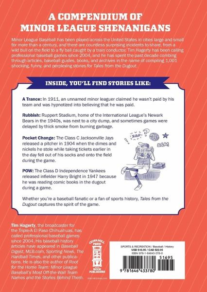 A wild bull on the field, a fly ball caught by a train conductor, a pitcher taking the mound barefoot—Minor League Baseball has been played across the country in cities large and small for more than a century, and there are thousands of entertaining and improbable stories to tell from it. Join professional baseball broadcaster Tim Hagerty for a journey through the zaniest Minor League stories in Tales from the Dugout. Given its long history, it is no surprise that the game has encountered some bizarre things over the years. This humorous and outlandish collection of stories is sourced from newspaper archives and the Baseball Hall of Fame Library in Cooperstown, New York, and includes a foreword by former MLB All-Star Billy Butler. Whether you're a baseball fanatic or just a fan of sports history, this book captures the spirit of the game. This compendium of minor league shenanigans includes: - HOLE IN ONE: In 1942, a Milwaukee Brewers batter hit a low line drive that bounced down the right field line. He rounded the bases while confused Louisville Colonels fielders searched for the ball. They eventually found it inside a gopher hole. - MONKEYING AROUND: A chimp's escape turned a Southern Association game into pandemonium on July 17, 1909. "Henry the Chimpanzee," the New Orleans Pelicans' official mascot, busted from his cage and chased players around the field. The chimp then went after fans, who ran from him screaming. The game was delayed a few minutes while Henry was restrained. - HEADLESS CRUSHER: A police department in Ohio got a call about a missing head. The Lake Erie Crushers' mascot's head was stolen in 2011, forcing the mascot to miss a few home games. After learning through media reports that police were investigating, the thief returned the head by inconspicuously placing it under the ballpark's tarp.