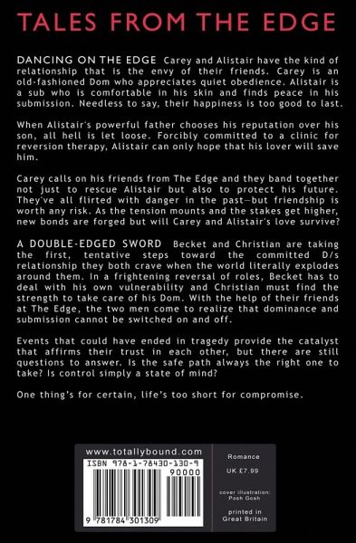 Dancing on the Edge Carey and Alistair have the kind of relationship that is the envy of their friends. Carey is an old-fashioned Dom who appreciates quiet obedience. Alistair is a sub who is comfortable in his skin and finds peace in his submission. Needless to say, their happiness is too good to last. When Alistair's powerful father chooses his reputation over his son, all hell is let loose. Forcibly committed to a clinic for reversion therapy, Alistair can only hope that his lover will save him. Carey calls on his friends from The Edge and they band together not just to rescue Alistair but also to protect his future. They've all flirted with danger in the past-but friendship is worth any risk. As the tension mounts and the stakes get higher, new bonds are forged but will Carey and Alistair's love survive? A Double-Edged Sword Becket and Christian are taking the first, tentative steps towards the committed D/s relationship they both crave when the world literally explodes around them. In a frightening reversal of roles, Becket has to deal with his own vulnerability and Christian must find the strength to take care of his Dom. With the help of their friends at The Edge, the two men come to realise that dominance and submission cannot be switched on and off. Events that could have ended in tragedy provide the catalyst that affirms their trust in each other, but there are still questions to answer. Is the safe path always the right one to take? Is control simply a state of mind? One thing's for certain, life's too short for compromise.