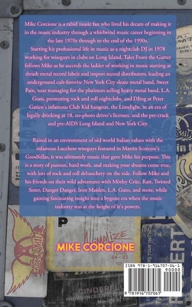 BOOK SUMMARY Mike Corcione is a rabid music fan who lived his dream of making it in the music industry through a whirlwind rock and roll career beginning in the late 1970s through the 1980s. Starting his professional life in music as a nightclub DJ in 1978 working for wiseguys in clubs on Long Island, Tales From the Gutter follows Mike as he ascends the ladder of working in music at thrash metal record labels and import record distributors, leading an underground cult-favorite New York City sleaze metal band, Sweet Pain, tour managing for the platinum selling heavy metal band, L.A. Guns, promoting rock and roll nightclubs, and DJing at Peter Gatien's infamous Club Kid hangout, the Limelight, in an era of legally drinking at 18, no-photo driver's licenses, and the pre-crack and pre-AIDS New York City. Raised in an environment of old world Italian values with the infamous Lucchese wiseguys featured in Martin Scorcese's Goodfellas, it was ultimately music that gave Mike his purpose. This is a story of passion, hard work, and making your dreams come true, with lots of rock and roll debauchery on the side. Follow Mike and his friends on their drug-fueled wild adventures with Mötley Crüe, Ratt, Twisted Sister, Danger Danger, Iron Maiden, L.A. Guns, and more, while gaining fascinating insight into a bygone era when the music industry was at the height of it's powers.