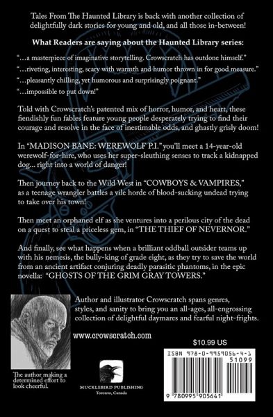 Author and illustrator Crowscratch brings fear, fright, and fun to the Haunted Library-collections of short stories and novellas aimed at middle-grade readers and up. Perfect for read-alongs, they contain just the right amount of horror, humor, and heart, to delight and entertain children and adults alike. In the first story, MADISON BANE: WEREWOLF P.I., a 14-year-old werewolf uses her super-sleuthing wolf senses to track down a kidnapped dog... right into a world of danger! Then journey back to the Weird West in COWBOYS & VAMPIRES, as a teenage wrangler battles a horde of blood-sucking undead that aim to take over his town! Then a young orphaned elf ventures into the perilous city of the dead, on a quest to steal a priceless gem, in THE THIEF OF NEVERNOR. And finally, a brainy oddball teams up with his arch-enemy, the grade eight bully, as they try to save the world from a supernatural creature conjuring deadly phantoms, in GHOSTS OF THE GRIM GRAY TOWERS. All that plus more fiendishly frightening fun!