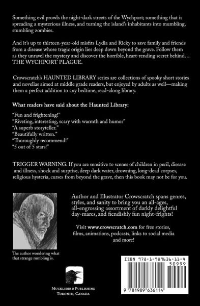 Crowscratch is back with a novel-length epic of supernatural spookiness: THE WYCHPORT PLAGUE. Something evil prowls the night-dark streets of Wychport; something spreading a mysterious illness that turns the island's inhabitants into mumbling, stumbling ZOMBIES. Now, it's up to thirteen-year-old misfits Lydia and Ricky, to save family and friends from a disease whose evil origins lie deep below the freezing depths of Lake Superior. Follow them as they battle the horrid horde in an attempt to discover the horrible, heart-rending secret behind THE WYCHPORT PLAGUE.