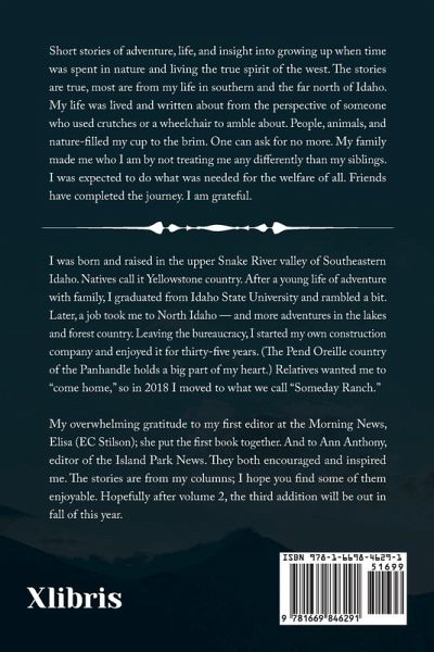 Short stories of adventure, life, and insight into growing up when time was spent in nature and living the true spirit of the west. The stories are true, most are from my life in southern and the far north of Idaho. My life was lived and written about from the perspective of someone who used crutches or a wheelchair to amble about. People, animals, and nature-filled my cup to the brim. One can ask for no more. My family made me who I am by not treating me any differently than my siblings. I was expected to do what was needed for the welfare of all. Friends have completed the journey. I am grateful.