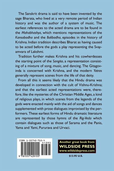The Sanskrit drama is said to have been invented by the sage Bharata, who lived at a very remote period of Indian history and was the author of a system of music. The earliest references to the acted drama are to be found in the Mahabhashya, which mentions representations of the Kansabadha and the Balibadha, episodes in the history of Krishna. Indian tradition describes Bharat as having caused to be acted before the gods a play representing the Svayamvara of Lakshmi. Tradition further makes Krishna and his cowherdesses the starting point of the Sangita, a representation consisting of a mixture of song, music, and dancing. The Gitagovinda is concerned with Krishna, and the modern Yatras generally represent scenes from the life of that deity. From all this it seems likely that the Hindu drama was developed in connection with the cult of Vishnu-Krishna; and that the earliest acted representations were, therefore, like the mysteries of the Christian Middle Ages, a kind of religious plays, in which scenes from the legends of the gods were enacted mainly with the aid of songs and dances supplemented with prose dialogues improvised by the performers. These earliest forms of Hindu dramatic literature are represented by those hymns of the Rig-Veda which contain dialogues such as those of Sarama and the Panis, Yama and Yami, Pururava and Urvaci.