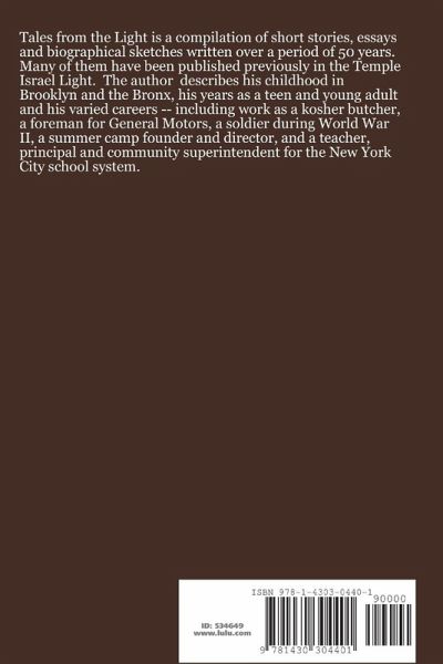 Tales from the Light is a compilation of short stories, essays and biographical sketches written over a period of 50 years. Author Milton J. Stier was born in 1919 in Austro-Hungry and immigrated to the United States with his parents as young child. His writings tell of his childhood in Brooklyn and the Bronx, his years as a teen and young adult and his varied careers -- including work as a kosher butcher, a foreman for General Motors, a soldier during World War II, and a teacher, principal and community superintendent for the New York City school system. In addition to essays and commentaries on contemporary life, the volume includes letters from Europe during the war and remembrances of founding and running a children's summer camp in the Catskills.