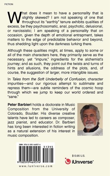 What does it mean to have a personality that is slightly skewed? I am not speaking of one that throughout its "earthly" tenure exhibits qualities of excess, be they psychosomatic, anal, psychotic, delusional, or narcissistic; I am speaking of a personality that on occasion, given the depth of emotional entrapment, takes matters to the edge of predictable behavior and beyond, thus shedding light upon the darkness lurking there. Although these qualities might, at times, apply to some or all of the main characters here, they primarily serve as the necessary, yet "impure", ingredients for the alchemist's journey; and as such, they point out the twists and turns of hints and allusions, the oddness of the plots, and, of course, the suggestion of larger, more intangible issues. In Tales from the Soft Underbelly of Confusion, character impurities-and our rigorous attempt to sublimate and repress them-are subtle reminders of the cosmic hoop through which we jump to keep our world ordered and "sane".
