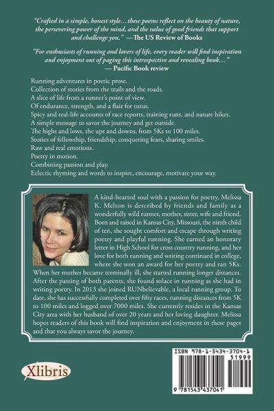 Running adventures in poetic prose Collection of stories from the trails and the roads. A slice of life from a runners point of view Of endurance, strength, and a flair for tutus. Spicy and real-life accounts of race reports, training runs, and nature hikes A simple message to savor the journey and get outside. The highs and lows, the ups and downs, from 5Ks to 100 miles Stories of fellowship, friendships, conquering fears, sharing smiles. Raw and real emotions Poetry in motion. Combining passion and play Eclectic rhyming words to inspire, encourage, motivate your ways.