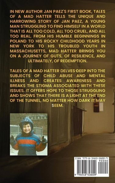 "TALES OF A MAD HATTER" is a raw and introspective memoir by Jan K. Paez that chronicles the author's tumultuous journey from childhood in Poland to adulthood in America. Born to a Polish mother and Ecuadorian father, Jan grapples with his mixed heritage and the feelings of not belonging to either culture. Through a series of poignant anecdotes, he shares his struggles with identity, family dynamics, and the impact of addiction on his life. From his chaotic youth in Harlem to the pressures of academic life at Northeastern University, Jan's story is one of resilience and self-discovery. He candidly recounts moments of joy and despair, revealing how these experiences shaped him into the person he is today. This memoir is not just a reflection on the past but also an exploration of the complexities of family relationships, societal expectations, and the quest for personal redemption. Join Jan on this heartfelt journey as he navigates the challenges of growing up between cultures, ultimately finding his voice and a deeper understanding of himself amidst the chaos of life.