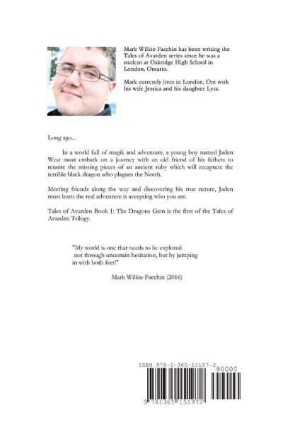 The Dragon's Gem tells the story of Jaden West, a young man who's thrown into an adventure of his life as he takes up with an old friend of his fathers. They must travel all of Western Avarden, seeking out the missing pieces of an ancient ruby; the only known artefact that can contain the might and power of Mallek, the terrible black dragon who plagues the North.