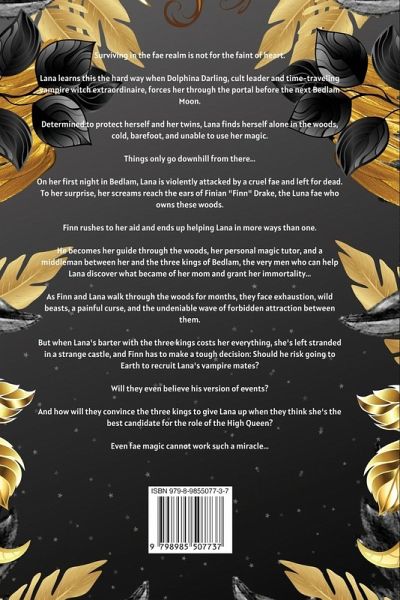 Surviving in the fae realm is not for the faint of heart. Lana learns this the hard way when Dolphina Darling, cult leader and time-traveling vampire witch extraordinaire, forces her through the portal before the next Bedlam Moon. Determined to protect herself and her twins, Lana finds herself alone in the woods, cold, barefoot, and unable to use her magic. Things only go downhill from there... On her first night in Bedlam, Lana is violently attacked by a cruel fae and left for dead. To her surprise, her screams reach the ears of Finian "Finn" Drake, the Luna fae who owns these woods. Finn rushes to her aid and ends up helping Lana in more ways than one. He becomes her guide through the woods, her personal magic tutor, and a middleman between her and the three kings of Bedlam, the very men who can help Lana discover what became of her mom and grant her immortality... As Finn and Lana walk through the woods for months, they face exhaustion, wild beasts, a painful curse, and the undeniable wave of forbidden attraction between them. But when Lana's barter with the three kings costs her everything, she's left stranded in a strange castle, and Finn has to make a tough decision: Should he risk going to Earth to recruit Lana's vampire mates? Will they even believe his version of events? And how will they convince the three kings to give Lana up when they think she's the best candidate for the role of the High Queen? Even fae magic cannot work such a miracle...