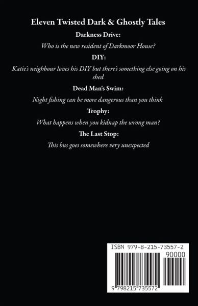 Eleven Twisted Dark & Ghostly Tales Darkness Drive: Who is the new resident of Darkmoor House? Anyone in need of comeuppance should be very, very careful DIY: Katie's neighbour loves his DIY but there's something else going on his shed Dead Man's Swim: Night fishing can be more dangerous than you think Til Death do us Part: Bert loved his wife so much that even death won't part them Justice: Jack is seeking justice and he doesn't care what he has to do to get it Trophy: What happens when you kidnap the wrong man? The Wind Blows East: A little coastal village is enveloped in a strange fog Sinking: Laura's estate would be a lovely place to live if it wasn't for a few bad people spoiling it for everyone else A Fair Trade: What would you be willing to do to right a wrong? As Luck Would Have It: Andy has a lucky coin but then his luck runs out The Last Stop: This bus goes somewhere very unexpected
