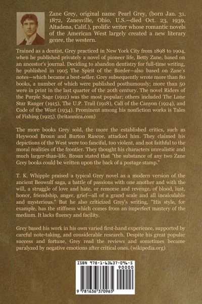 Pearl Zane Grey, the fourth child of Alice Josephine Zane and Lewis Gray, was born in Zanesville, Ohio. After Zane's birth, the family changed their last name from Gray to Grey. Lewis Grey, a dentist, did not want his son to waste his time writing stories. Lewis ripped up Zane's first story when he was only fifteen. The only thing Zane wanted to do was play baseball and write, but he was forced into dentistry for practical reasons. Zane attended the University of Pennsylvania on a baseball scholarship. He was a decent athlete and played in the minor leagues. After graduation with a degree in dentistry, Zane moved to New York and opened his dentistry business where he struggled with his need to write. He went camping and fishing with his brother in Pennsylvania where he met Lina Roth, known as Dolly. Zane and Dolly were married in 1905. He warned her he would not stop being a free spirit and had numerous affairs after his marriage. In 1918, the Zanes moved to California and settled in Altadena in 1920. Dolly, a former schoolteacher, edited all of Zane's manuscripts and managed his career including all his contracts. Zane traveled and explored the west, went fishing, and wrote. He had a cabin in Oregon on the Rogue River, and in the desert by the Mogollon Rim near Payson, Arizona. He wrote articles for magazines, serializations, and novels. His most famous novel was Riders of the Purple Sage. In 1939, Zane Grey died at the age of 67. After his death, his wife and son published some of his unfinished novels. At least fifty movies were made based on his novels.