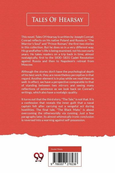 This novel, Tales Of Hearsay is written by Joseph Conrad. Conrad reflects on his native Poland and Russia in ""The Warrior's Soul"" and ""Prince Roman,"" the first two stories in this collection. But he does so in a very different way. His grandfather's life is being examined, not his own early years. He takes readers on a trip back in time, almost nostalgically, first to the 1830-1831 Cadet Revolution against Russia and then to Napoleon's retreat from Moscow. Although the stories don't have the psychological depth of his best work, they are nevertheless perceptive in that regard. Another element is in play while we read them as well. In effect, we have a perspective comparable to that of standing between two mirrors and seeing many reflections of existence as we look back on Conrad's writings, which also have a nostalgic quality. It turns out that the third story, ""The Tale,"" is not that. It is a confession that reveals the inner guilt that a naval captain felt after carrying out a vengeful act during hostilities. The final tale, ""The Black Mate,"" is about overcoming the otherworldly via cunning. Just a few paragraphs later, its almost whimsically ironic conclusion is reversed into a warning against self-possession.