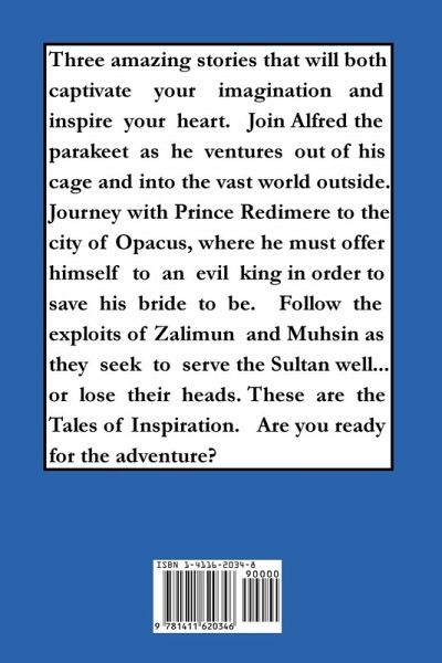 Three amazing stories that will both captivate your imagination and inspire your heart. Join Alfred the parakeet as he ventures out of his cage and into the vast world outside. Follow the exploits of Zalimun and Muhsin as they must seek to serve the Sultan well...or lose their heads. Journey with Prince Redimere to the city of Opacus, where he must offer himself to an evil king in order to save his bride to be. These are the Tales of Inspiration. Are you ready for the adventure?