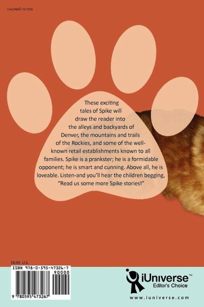 These exciting tales of Spike will draw the reader into the alleys and backyards of Denver, the mountains and trails of the Rockies, and come of the well-known retail establishments known to all families. Spike is a prankster; he is a formidable opponent; he is smart and cunning. Above all, he is loveable. Listen-and you'll hear the children begging, "Read us some more Spike stories!"