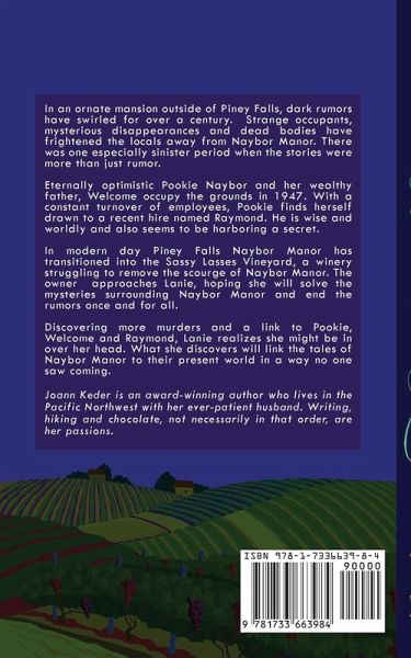A beautiful winery with a deadly past! In a historic mansion outside of Piney Falls, dark rumors have swirled for over a century. Strange occupants, mysterious disappearances and unexplained deaths have frightened the locals away from Naybor Manor. Modern day Naybor Manor has transitioned into the Sassy Lasses Vineyard, a winery struggling to remove the scourge of its past. Word of Lanie's sleuthing skills has reached the owner. She wants Lanie to uncover the truth of Naybor Manor and end the rumors once and for all. When more bodies are discovered, Lanie realizes she might be in over her head. What she uncovers will link the tales of Naybor Manor to their present world in a way no one saw coming. This is the third book in the Piney Fall Series by USA TODAY Bestselling author, Joann Keder.