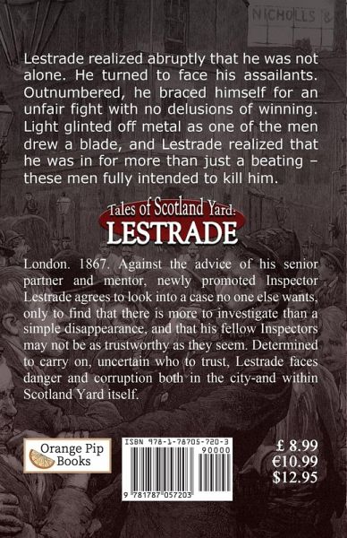 Lestrade realized abruptly that he was not alone. He turned to face his assailants. Outnumbered, he braced himself for a unfair fight with no delusions of winning. Light glinted off metal as one of the men drew a blade, and Lestrade realized that he was in for more than just a beating - these men fully intended to kill him. London. 1867. Against the advice of his senior partner and mentor, newly promoted Inspector Lestrade agrees to look into a case no one else wants, only to find that there is more to investigate than a simple disappearance, and that his fellow Inspectors may not be as trustworthy as they seem. Determined to carry on, uncertain who to trust, Lestrade faces danger and corruption both in the city-and within Scotland Yard itself.