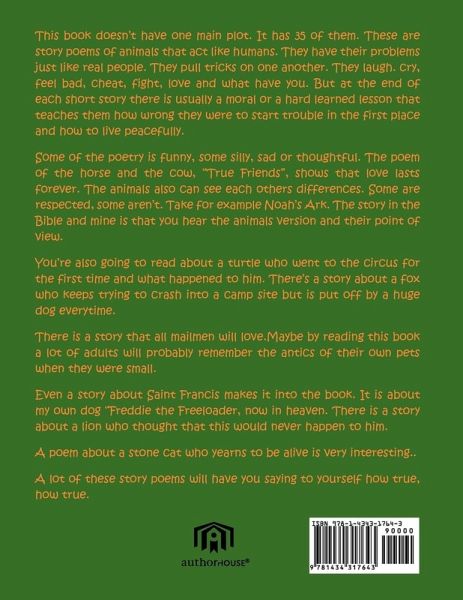 This book doesn't have one main plot. It has 35 of them. These are story poems of animals that act like humans. They have their problems just like real people. They pull tricks on one another. They laugh. cry, feel bad, cheat, fight, love and what have you. But at the end of each short story there is usually a moral or a hard learned lesson that teaches them how wrong they were to start trouble in the first place and how to live peacefully. Some of the poetry is funny, some silly, sad or thoughtful. The poem of the horse and the cow, "True Friends", shows that love lasts forever. The animals also can see each others differences. Some are respected, some aren't. Take for example Noah's Ark. The story in the Bible and mine is that you hear the animals version and their point of view. You're also going to read about a turtle who went to the circus for the first time and what happened to him. There's a story about a fox who keeps trying to crash into a camp site but is put off by a huge dog everytime. There is a story that all mailmen will love.Maybe by reading this book a lot of adults will probably remember the antics of their own pets when they were small. Even a story about Saint Francis makes it into the book. It is about my own dog "Freddie the Freeloader, now in heaven. There is a story about a lion who thought that this would never happen to him. A poem about a stone cat who yearns to be alive is very interesting.. A lot of these story poems will have you saying to yourself how true, how true.
