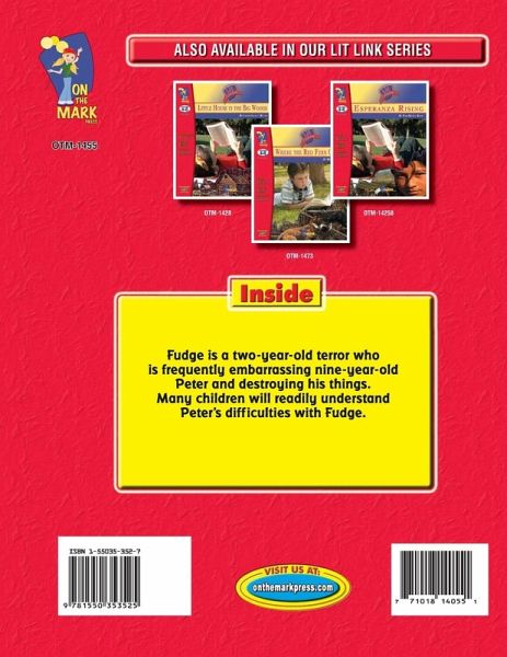 Fudge is a two-year-old terror who is frequently embarrassing nine-year-old Peter and destroying his things. Peter feels that his parents allow Fudge to get away with many things and he feels that they give him more attention. He is very discouraged with his situation and often feels like a fourth grade nothing. The day that Fudge walks off with Dribble, Peter's pet turtle is the last straw. Many children will readily understand Peter's difficulties with Fudge. Novel by Judy Blume. Reproducible chapter questions, plus comprehension questions, a story summary, author biography, creative and cross curricular activities, complete with answer key. 64 pages including an answer key. Students will ¿ enjoy and appreciate the humor written in good literature. ¿ become acquainted with the writings of Judy Blume ¿ further develop their reading and writing skills.