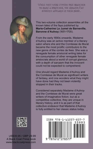 This two-volume collection assembles all the known tales of the fays published by Marie-Catherine Le Jumel de Barneville, Baronne d’Aulnoy (1651-1705). From the early 1690s onwards, Madame d’Aulnoy was an active member of a literary salon where she and the Comtesse de Murat became the most prolific contributors to the new genre of the contes de fees, which they helped invent, shape and develop. Like almost all of the other members of her coterie, she became a renegade female aristocrat writing tales for the select consumption of other renegade female aristocrats about a world the corrupt glamour of which they understood only too well, with a depth of sarcasm that the innocent could not be expected to comprehend. One should regard Madame d’Aulnoy and the Comtesse de Murat as significant writers of Decadent fantasy, and one wonders what they might have done had they been allowed to continue with their work. Given that both had extraordinary imaginative range, it is hard to imagine that they would have run out of inspiration, had they not been violently stopped in their tracks. We have to be grateful that they contrived to publish as much as they did during their brief window of opportunity, leaving behind fugitive material that could be recovered once the worst of the repression had blown over. Considered separately Madame d’Aulnoy and the Comtesse de Murat were great writers of imaginative fiction, but as a competitive collective, they are unique in literary history, and it is as part of that collective endeavor that Madame d’Aulnoy is fully entitled to her classic status today.