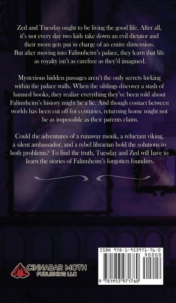 Zed and Tuesday ought to be living the good life. After all, it's not every day two kids take down an evil dictator and their mom gets put in charge of an entire dimension. But after moving into Falinnheim's palace, they learn that life as royalty isn't as carefree as they'd imagined. Mysterious hidden passages aren't the only secrets lurking within the palace walls. When the siblings discover a stash of banned books, they realize everything they've been told about Falinnheim's history might be a lie. And though contact between worlds has been cut off for centuries, returning home might not be as impossible as their parents claim. Could the adventures of a runaway monk, a reluctant viking, a silent ambassador, and a rebel librarian hold the solutions to both problems? To find the truth, Tuesday and Zed will have to learn the stories of Falinnheim's forgotten founders.
