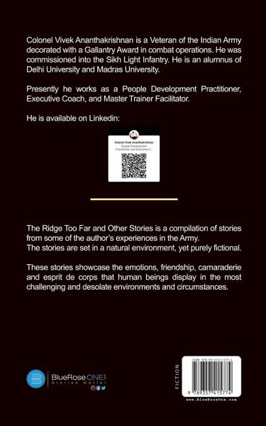 ""The Ridge Too Far and Other Stories are tales from some of the author's experiences in the Army. The stories are purely fictional. About emotions, friendship, camaraderie, and esprit de corps that ordinary human beings display in the most challenging and desolate environments and circumstances. These stories also are about exceptional leaders and their decisions.""