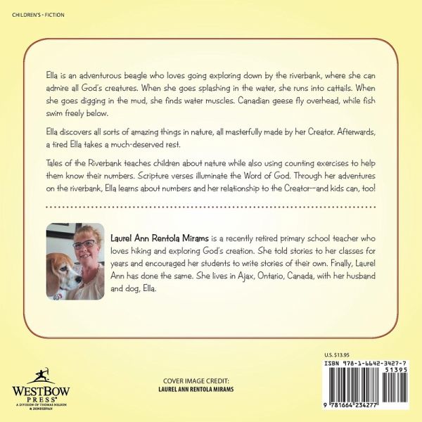 Ella is an adventurous beagle who loves going exploring down by the riverbank, where she can admire all God's creatures. When she goes splashing in the water, she runs into cattails. When she goes digging in the mud, she finds water muscles. Canadian geese fly overhead, while fish swim freely below. Ella discovers all sorts of amazing things in nature, all masterfully made by her Creator. Afterwards, a tired Ella takes a much-deserved rest. Tales of the Riverbank teaches children about nature while also using counting exercises to help them know their numbers. Scripture verses illuminate the Word of God. Through her adventures on the riverbank, Ella learns about numbers and her relationship to the Creator-and kids can, too!