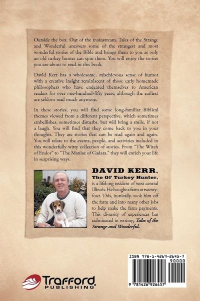 Outside the box. Out of the mainstream. Tales of the Strange and Wonderful uncovers some of the strangest and most wonderful stories of the Bible and brings them to you as only an old turkey hunter can spin them. You will enjoy the stories you are about to read in this book. David Kerr has a wholesome, mischievous sense of humor with a creative insight reminiscent of those early homemade philosophers who have endeared themselves to American readers for over one-hundred-fifty years; although the earliest are seldom read much anymore. In these stories, you will find some long-familiar Biblical themes viewed from a different perspective, which sometimes embellishes, sometimes disturbs, but will bring a smile, if not a laugh. You will find that they come back to you in your thoughts. They are stories that can be read again and again. You will relate to the events, people, and activities included in this wonderfully witty collection of stories. From "The Witch of Endor" to "The Maniac of Gardara," they will enrich your life in surprising ways.