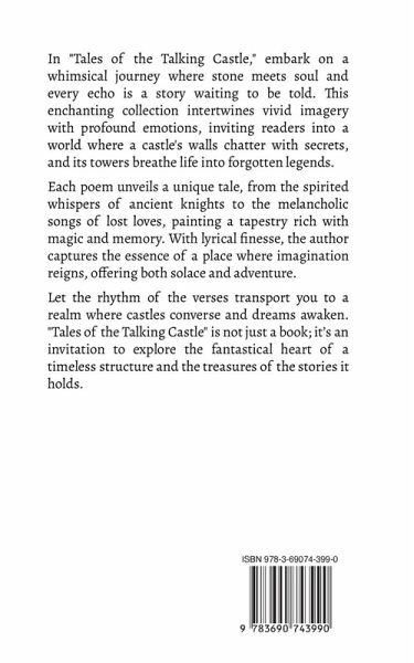 In "Tales of the Talking Castle," embark on a whimsical journey where stone meets soul and every echo is a story waiting to be told. This enchanting collection intertwines vivid imagery with profound emotions, inviting readers into a world where a castle's walls chatter with secrets, and its towers breathe life into forgotten legends. Each poem unveils a unique tale, from the spirited whispers of ancient knights to the melancholic songs of lost loves, painting a tapestry rich with magic and memory. With lyrical finesse, the author captures the essence of a place where imagination reigns, offering both solace and adventure. Let the rhythm of the verses transport you to a realm where castles converse and dreams awaken. "Tales of the Talking Castle" is not just a book; it's an invitation to explore the fantastical heart of a timeless structure and the treasures of the stories it holds.