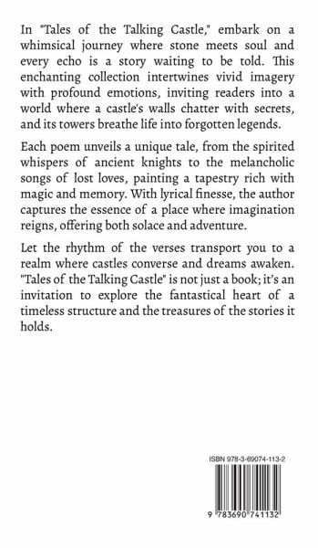 In "Tales of the Talking Castle," embark on a whimsical journey where stone meets soul and every echo is a story waiting to be told. This enchanting collection intertwines vivid imagery with profound emotions, inviting readers into a world where a castle's walls chatter with secrets, and its towers breathe life into forgotten legends. Each poem unveils a unique tale, from the spirited whispers of ancient knights to the melancholic songs of lost loves, painting a tapestry rich with magic and memory. With lyrical finesse, the author captures the essence of a place where imagination reigns, offering both solace and adventure. Let the rhythm of the verses transport you to a realm where castles converse and dreams awaken. "Tales of the Talking Castle" is not just a book; it's an invitation to explore the fantastical heart of a timeless structure and the treasures of the stories it holds.