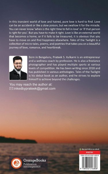 In this transient world of love & hatred, pure love is hard to find. Love can be an accident or like a slow poison but swallow it for the miracle. You can never know 'when is the right time to fall in love' or 'if that person is right for you'. But you have to make it right. Love is like an external world that becomes a home or if it is failed to be treasured, it is obvious that you have to move on and find happiness. Tales of the Twilight is a collection of micro-tales, poems and poetries that takes you on a beautiful journey of love, romance & heartaches.
