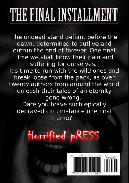 The undead stand defiant before the dawn, determined to outlive and outrun the end of forever. One final time we shall know their pain and suffering for ourselves. It's time to run with the wild ones and break loose from the pack, as over twenty authors from around the world unleash their tales of an eternity gone wrong. Dare you brave such epically depraved circumstance one final time?