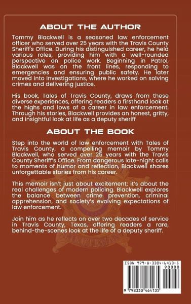 Step into the gritty and adrenaline-fueled world of law enforcement with Tales of Travis County, a memoir by Tommy Blackwell, a seasoned officer who spent over 25 years with the Travis County Sheriff's Office. From heart-pounding moments on the front lines to quiet reflections on what it means to serve and protect, Blackwell shares unforgettable stories that capture both the intensity and humanity of policing. His firsthand experiences offer readers a rare and authentic glimpse into the life of a deputy sheriff, filled with danger, humor, and deep insight.