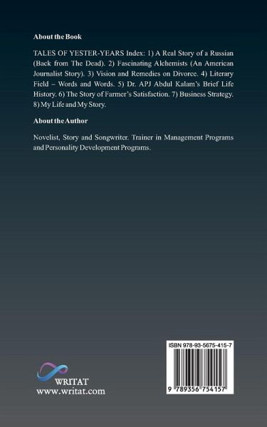 TALES OF YESTER-YEARS Index: 1) A Real Story of a Russian (Back from The Dead). 2) Fascinating Alchemists (An American Journalist Story). 3) Vision and Remedies on Divorce. 4) Literary Field - Words and Words. 5) Dr. APJ Abdul Kalam's Brief Life History. 6) The Story of Farmer's Satisfaction. 7) Business Strategy. 8) My Life and My Story.