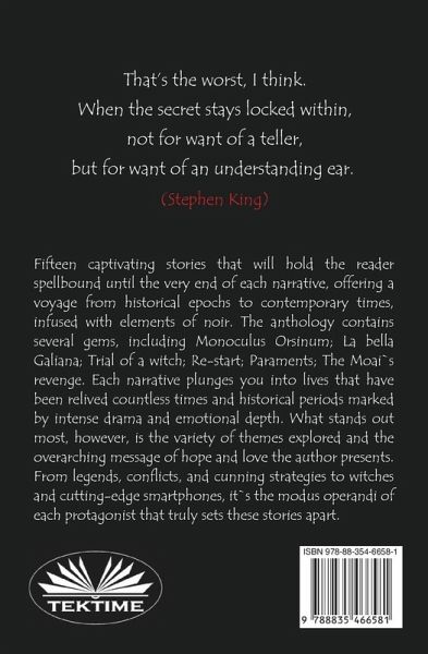 That's the worst, I think. When the secret stays locked within, not for want of a teller, but for want of an understanding ear (Stephen King) Fifteen captivating stories that will hold the reader spellbound until the very end of each narrative, offering a voyage from historical epochs to contemporary times, infused with elements of noir. The anthology contains several gems, including Monoculus Orsinum; The beautiful Galiana; Trial of a witch; Re-start; Paraments; The Moai's revenge. Each narrative plunges you into lives that have been relived countless times and historical periods marked by intense drama and emotional depth. What stands out most, however, is the variety of themes explored and the overarching message of hope and love the author presents. From legends, conflicts, and cunning strategies to witches and cutting-edge smartphones, it's the modus operandi of each protagonist that truly sets these stories apart.