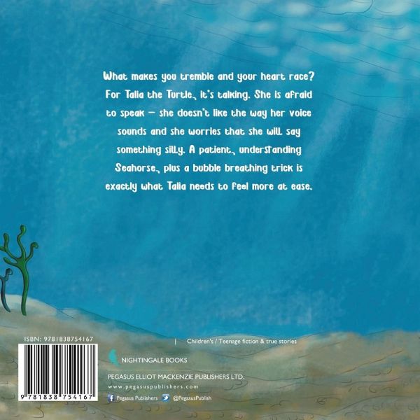What makes you tremble and your heart race? For Talia the Turtle, it's talking. She is afraid to speak - she doesn't like the way her voice sounds and she worries that she will say something silly. A patient, understanding Seahorse, plus a bubble breathing trick is exactly what Talia needs to feel more at ease.