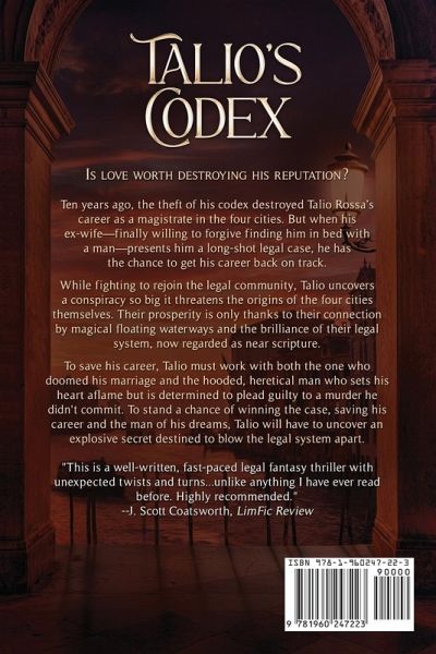 Is love worth destroying his reputation? Ten years ago, the theft of his codex destroyed Talio Rossa's career as a magistrate in the four cities. But when his ex-wife-finally willing to forgive finding him in bed with a man-presents him a long-shot legal case, he has the chance to get his career back on track. While fighting to rejoin the legal community, Talio uncovers a conspiracy so big it threatens the origins of the four cities themselves. Their prosperity is only thanks to their connection by magical floating waterways and the brilliance of their legal system, now regarded as near scripture. To save his career, Talio must work with both the one who doomed his marriage and the hooded, heretical man who sets his heart aflame but is determined to plead guilty to a murder he didn't commit. To stand a chance of winning the case, saving his career and the man of his dreams, Talio will have to uncover an explosive secret destined to blow the legal system apart. Find out what happens in Talio's Codex by J. Alexander Cohen!