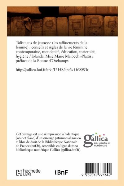 Talismans de jeunesse (les raffinements de la femme): conseils et regles de la vie feminine contemporaine, mondanite, education, maternite, hygiene / Iolanda, Mise Marie Maiocchi-Plattis; preface de la Bonne d'OrchampsDate de l'edition originale: 19..Ce livre est la reproduction fidele d'une oeuvre publiee avant 1920 et fait partie d'une collection de livres reimprimes a la demande editee par Hachette Livre, dans le cadre d'un partenariat avec la Bibliotheque nationale de France, offrant l'opportunite d'acceder a des ouvrages anciens et souvent rares issus des fonds patrimoniaux de la BnF.Les oeuvres faisant partie de cette collection ont ete numerisees par la BnF et sont presentes sur Gallica, sa bibliotheque numerique.En entreprenant de redonner vie a ces ouvrages au travers d'une collection de livres reimprimes a la demande, nous leur donnons la possibilite de rencontrer un public elargi et participons a la transmission de connaissances et de savoirs parfois difficilement accessibles.Nous avons cherche a concilier la reproduction fidele d'un livre ancien a partir de sa version numerisee avec le souci d'un confort de lecture optimal. Nous esperons que les ouvrages de cette nouvelle collection vous apporteront entiere satisfaction.Pour plus d'informations, rendez-vous sur www.hachettebnf.frhttp: //gallica.bnf.fr/ark: /12148/bpt6k5568893r