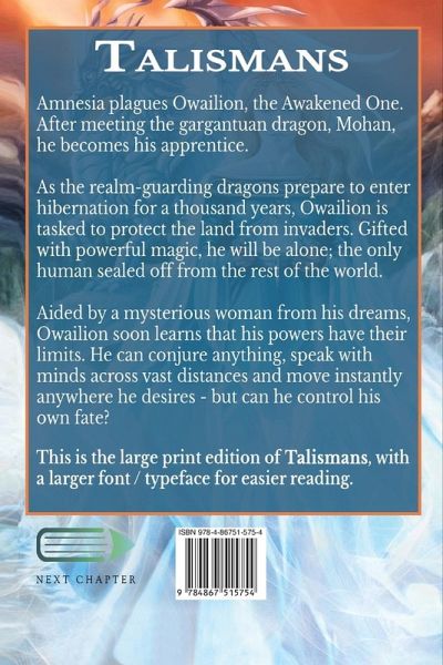 Amnesia plagues Owailion, the Awakened One. After meeting the gargantuan dragon, Mohan, he becomes his apprentice. As the realm-guarding dragons prepare to enter hibernation for a thousand years, Owailion is tasked to protect the land from invaders. Gifted with powerful magic, he will be alone; the only human sealed off from the rest of the world. Aided by a mysterious woman from his dreams, Owailion soon learns that his powers have their limits. He can conjure anything, speak with minds across vast distances and move instantly anywhere he desires - but can he control his own fate? This is the large print edition of Talismans, with a larger font / typeface for easier reading.