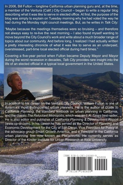 Talk City is a collection of the remarkable blogs the distinguished urban planner Bill Fulton wrote while serving as a member of the City Council in the California beach town of Ventura. The blog started out as a way to explain what had happened at the weekly council meetings. Before long, however, it turned into an evocative, real-time chronicle of what it was like to serve as an underpaid, overstressed, part-time local elected official during hard times. If you like local government and politics, you'll love how Talk City reveals the stresses and strains of serving as an elected official in a typical American city.
