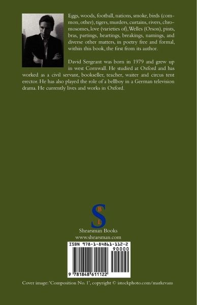 Eggs, woods, football, nations, smoke, birds (common, other), tigers, murders, curtains, rivers, chromosomes, love (varieties of), Welles (Orson), pints, bras, partings, heartings, breakings, namings, and diverse other matters, in poetry free and formal, within this book, the first from its author.