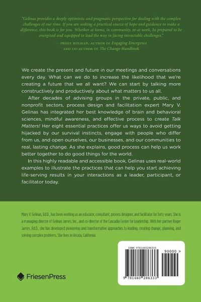 We create the present and future in our meetings and conversations every day. What can we do to increase the likelihood that we're creating a future that we all want? We can start by talking more constructively and productively about what matters to us all. After decades of advising groups in the private, public, and nonprofit sectors, process design and facilitation expert Mary V. Gelinas has integrated her best knowledge of brain and behavioral sciences, mindful awareness, and effective process to create Talk Matters! Her eight essential practices offer us ways to avoid getting hijacked by our survival instincts, engage with people who differ from us, and open ourselves, our businesses, and our communities to real, lasting change. As she explains, good process can help us work better together to do good things for the world. In this highly readable and accessible book, Gelinas uses real-world examples to illustrate the practices that can help you start achieving life-serving results in your interactions as a leader, participant, or facilitator today.